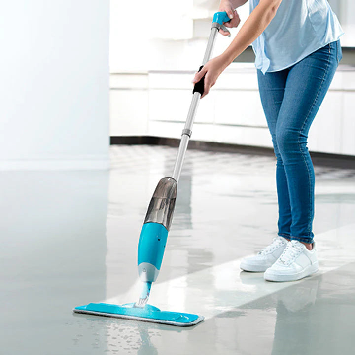 Sistema de Spray Integrado: Esta mopa cuenta con un sistema de spray integrado que te permite rociar directamente agua o solución de limpieza en el piso mientras limpias. Simplemente presiona el botón del mango y rocía la cantidad necesaria para una limpieza efectiva.